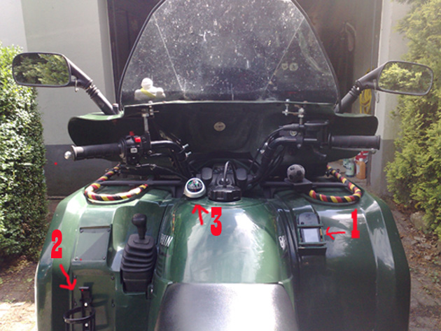(GPS-Empfänger) Marke Eigenbau 2 = Getränkehalterung für das alkofreie Bier oder das Mineralwasser bei langen Cachetouren 3 = Billiger Autokompass der nicht wirklich funktioniert und nur zur Zierde da klebt |