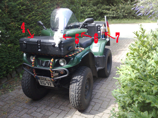 In dieser Box lässt sich schon einiges transportieren 5 = Bibendum, ja so heißt das legendäre "Michelinmännchen" korrekterweise 6 = Windschild ermöglicht es auch im Winter noch einigermassen komfortabel mit dem ATV zu fahren. 7 = Figur von Rafael van der Vaart Als absoluter HSV-Fan (Mitglied) war das ein muss.