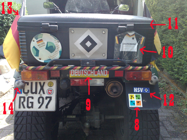 für einen Geocacher im Einsatz. 9 = Kennzeichnung meines bevorzugten Cachelandes. 10 = Mini Deutschland Trikot 11 = Große Kolpin Heck Box In dieser Box lässt sich alles transportieren was man so zum Cachen braucht z.B. Klamotten, etwas Essbares für unterwegs, Cachebeschreibungen etc. 12 = HSV Aufkleber 13 = Deutschland Fahne (wird während der Bundesligasaison natürlich durch eine HSV-Fahne ersetzt) 14 = Fußball, der dort schon seit der WM 2006 seinen Dienst verrichtet. |